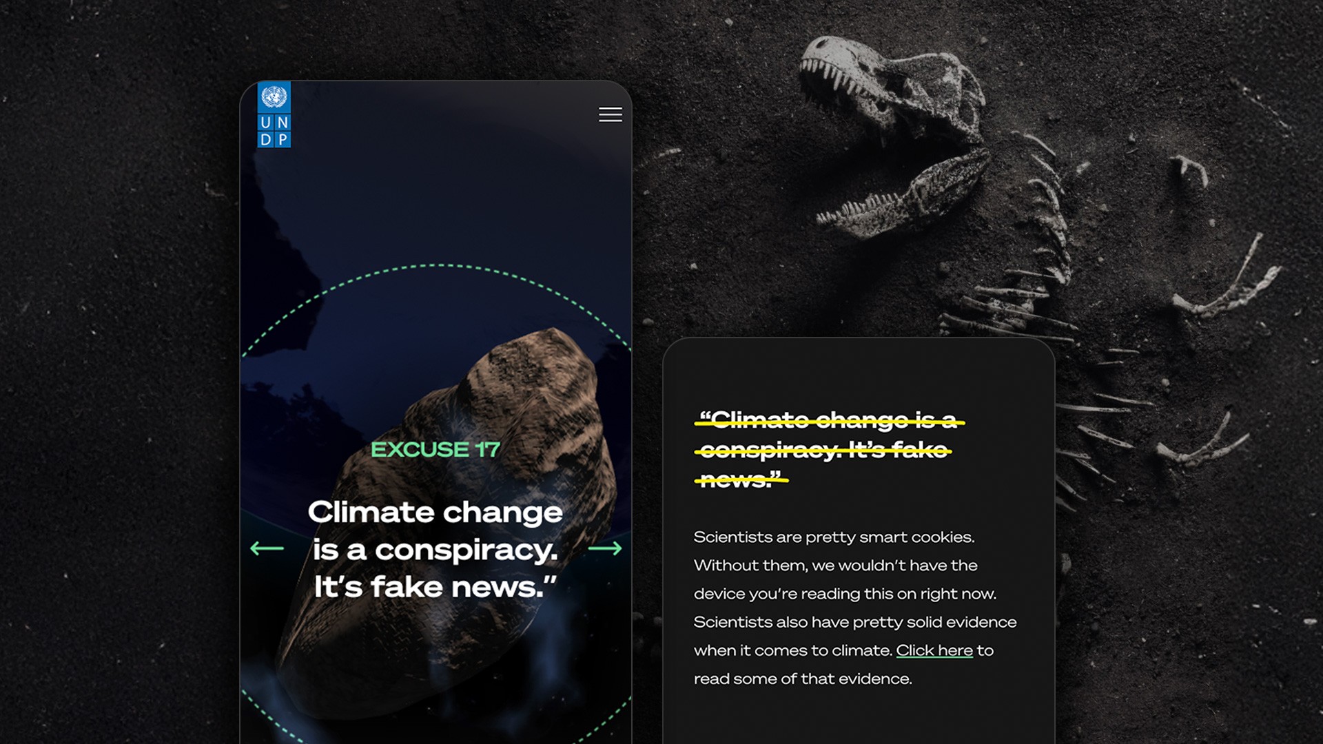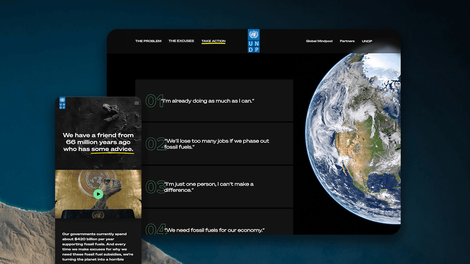 What's our excuse? The dinosaurs had one in the form of an asteroid, but we don't. The aim of the website is to inspire the world to move from apathy to action by allowing users to click into each excuse that threatens our survival, pictured as asteroids looming above the earth. Within each they will find information to debunk that excuse, and tools to provide direct action.