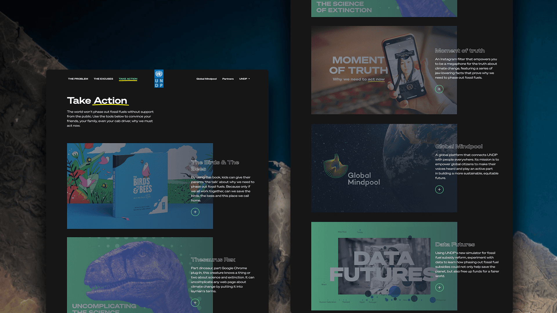 In partnership with the United Nations Development Program (UNDP), Wunderman Thompson developed a campaign supported by an interactive online experience, showcased at the 2021 United Nations Summit. My role was to design a website to showcase the unique initiatives and content created as part of the Don't Choose Extinction campaign.